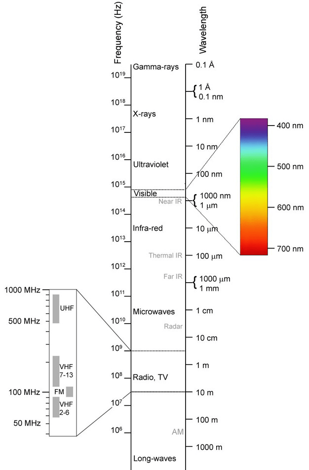 Figure: The electromagnetic spectrum, from radio to gamma rays. Humans see only the narrow visible band (about 400–700 nm); other animals and devices detect the rest (inset).