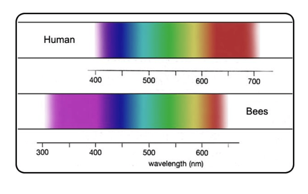 - Light and Color: Humans have three types of color cones (red, green, blue) tuned to 400–700 nm. Bees have three types too, but they see UV and lack red. The diagram below compares the human versus bee visible spectrum. (Bees’ vision spans roughly 300–650 nm, letting them see ultraviolet patterns on flowers.)